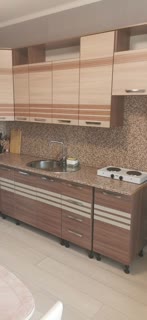 Готовность к проживанию подчеркивается сохранением функциональной мебели — кухонного гарнитура и шкафов для хранения вещей.